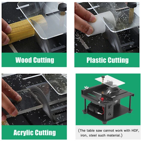 | Cette scie des ménages est durable, portable, pratique et facile à utiliser. Non seulement la coupe, il est capable de polir ou graver avec le versement d’accessoires correspondants. Également comporté avec moteur de puissance élevée, il peut atteindre une vitesse de coupe élevée de 3000rpm de bois coupé, panneau en matière plastique, panneau acrylique et plus avec efficacité. Faire emploi coupe plus facile. Traits: Puissant moteur – moteur à grande vitesse offre une vitesse de 1000 à 3000rpm, supports profondeur de coupe jusqu’à 35 mm, aide à l’emploi de coupe complète efficacement et facilement. 7 Niveau de vitesse réglable – Livré avec adaptateur secteur vitesse réglable 7 de vitesse, il permet la rotation facile contrôle de vitesse pour différents travaux de coupe. Haute précision – Equipé du Backer et marqué avec l’échelle, il assure des coupes précises et droites, la sécurité dans le processus de coupe. Taille compacte – Les mesures de scie de table 19 * 16,5 * 10cm de taille portable et poids, 67,93 oz pour un transport facile et un rangement pratique à la maison. Applications larges – Il est largement utilisé pour couper le métal mou et d’autres matériaux, comme l’aluminium, le bois, le plastique, acrylique, etc. (. Ne peut pas travailler avec HDF, fer, acier et plus) Qualité fiable – Fait de matériaux de haute qualité et sélectionné des composants électroniques, il Caractéristiques des performances stables et de durabilité pour une utilisation. 0 ° -90 ° Réglage de l’angle – goniomètre Easy-Set permet angle de coupe réglable de 0 ° à 90 °, coupe précise et rapide avec facilité. Caractéristiques: Matière: Métal + composants électroniques La couleur noire Plug: EU Plug, Plug US (en option) Type: Version de base, version Deluxe (Facultatif) Puissance nominale d’entrée: 200W Tension: 24V Courant: 20A Vitesse du moteur: 10000rpm Vitesse de sortie: 1000 ~ 3000rpm Profondeur de coupe: 0 ~ 35 mm 7 niveau Réglage de la vitesse: Oui Réglage de l’angle: 0 ~ 90 ° Diamètre de la lame de scie: 110mm / 4.33in Poids de l’article: 1926g / 67,93 oz Point Taille: 19 * 16,5 * 10cm / 7,48 * 6,49 * 3.93in Poids du paquet: Version de base: 3100g / 109,34 oz Version Deluxe: 3500g / 123,45 oz Taille du paquet: 24 * 22 * ??17cm / 9,22 * 8,66 * 6.69in Remarque: Cette scie à table ne peut pas être utilisé pour couper planche haute densité, le fer, l’acier. En raison de la mesure manuelle, il peut y avoir un écart. En raison de l’éclairage, l’image et objet matériel peuvent différer légèrement en couleurs, s’il vous plaît à l’emporter nature. Liste de colisage: 1 * Scie à table 1 * Adaptateur 1 * Manuel de l’utilisateur 1 * Lame de scie 1 * tournevis 1 * Couverture Transparent 2 * Clé 2 * Wing Nut 1 * écrou d’accouplement 1 * Cap Nut 1 * Backer 1 * Mandrin 1 * Meule 5 * Piece Ponçage 1 * Saw Emery titane plaqué lame (uniquement pour la version Deluxe) 1 * Saw lame en acier (uniquement pour la version Deluxe) 1 * Scie de résine Lame (uniquement pour la version Deluxe) 1 * arbre flexible (uniquement pour la version Deluxe) |