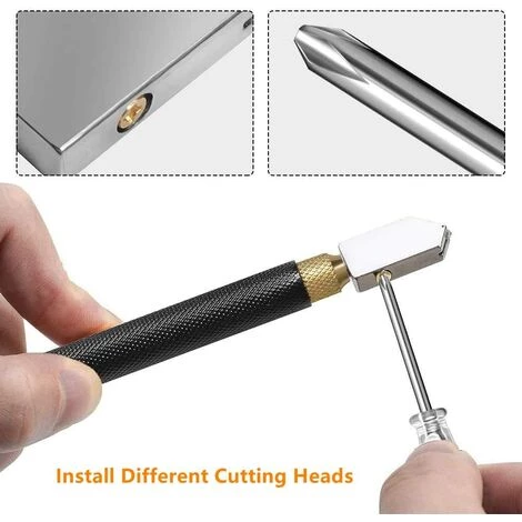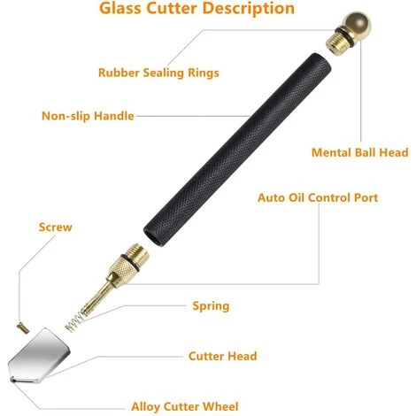 【Auto-huilage】Tête de coupe-verre rotative à 360 degrés remplaçable avec réservoir d’huile interne. Utilisez un compte-gouttes pour ajouter du kérosène à l’outil de coupe du verre afin de rendre la tête de coupe plus lisse et plus nette.