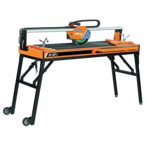 Construction : Tête pivotante, Panneau latéral intégré, Poignées rabattables, Pieds rabattables, Roues de transport, Guide avec angle de coupe réglable, Table de coupe amovible, Table recouverte de caoutchouc + pinces