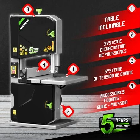 Cette scie à ruban 250 W de la marque Constructor est idéale pour la coupe rapide et précise du bois dur et tendre. Cette scie robuste possède une vitesse de coupe de 950 M/Min et dispose d’une hauteur de coupe de 80 mm à 90° et de 45 mm à 45 °. Cette scie à ruban est livrée avec un guide latéral afin de réaliser des coupes droites et précises.