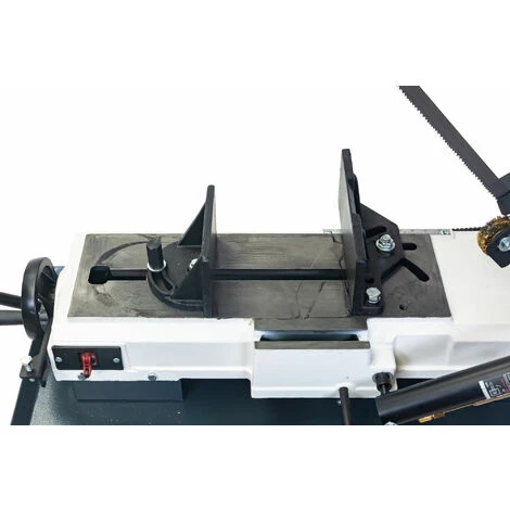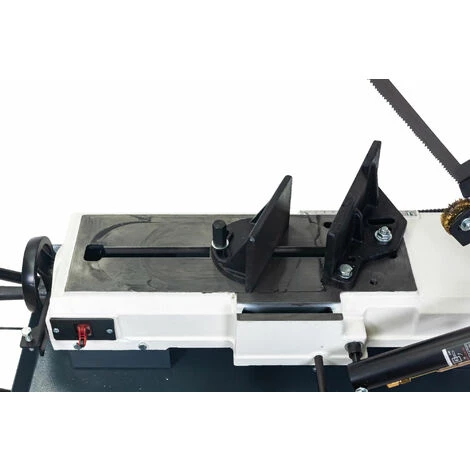 Scie à ruban robuste mobile avec entraînement par engrenage et pression de coupe réglable en continu.