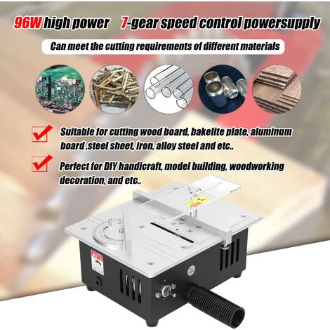 Il s’agit d’une sorte de mini scie à table multifonction, livrée avec des alimentations électriques de contrôle de vitesse à 7 vitesses haute puissance de 96 W, avec fonction de meulage, peut répondre aux exigences de coupe de différents matériaux. Livré avec un tuyau de dépoussiérage permettant de le connecter au dépoussiéreur afin que les débris générés lors de la coupe soient exempts d’éclaboussures et plus sûrs. Multifonctionnel, livré avec 4 lames de scie fabriquées dans un matériau différent, peut répondre complètement aux exigences d’une utilisation quotidienne. Équipé d’une fonction de meulage et livré avec un disque de meulage de 50 mm de diamètre et 10 papiers de verre assortis. Parfait pour le bricolage, la construction de modèles, la décoration du travail du bois, etc. Vous pouvez essayer.